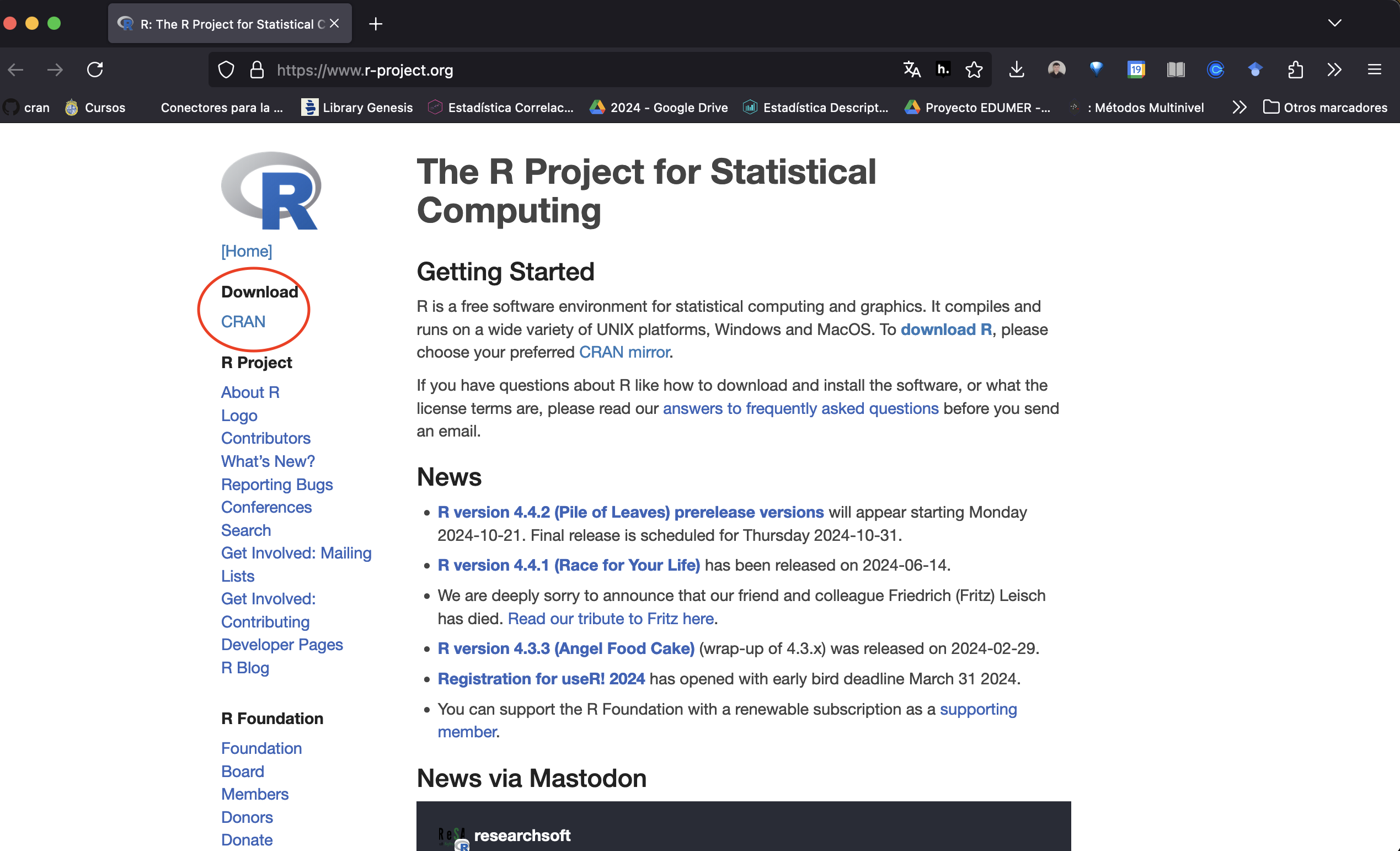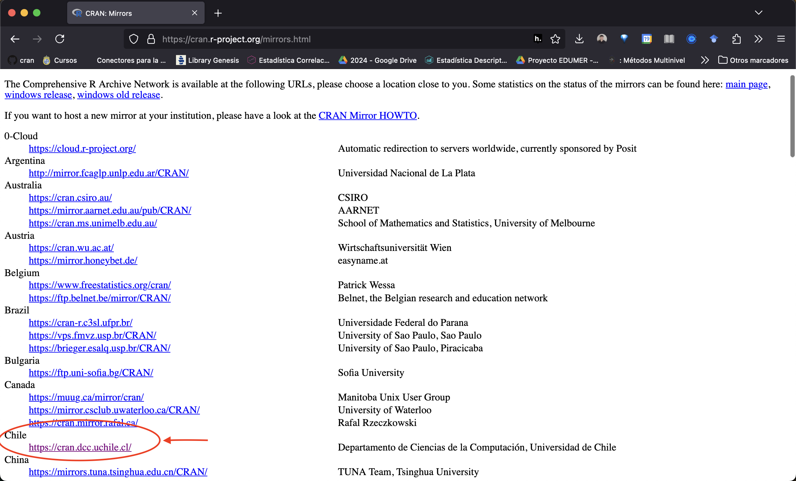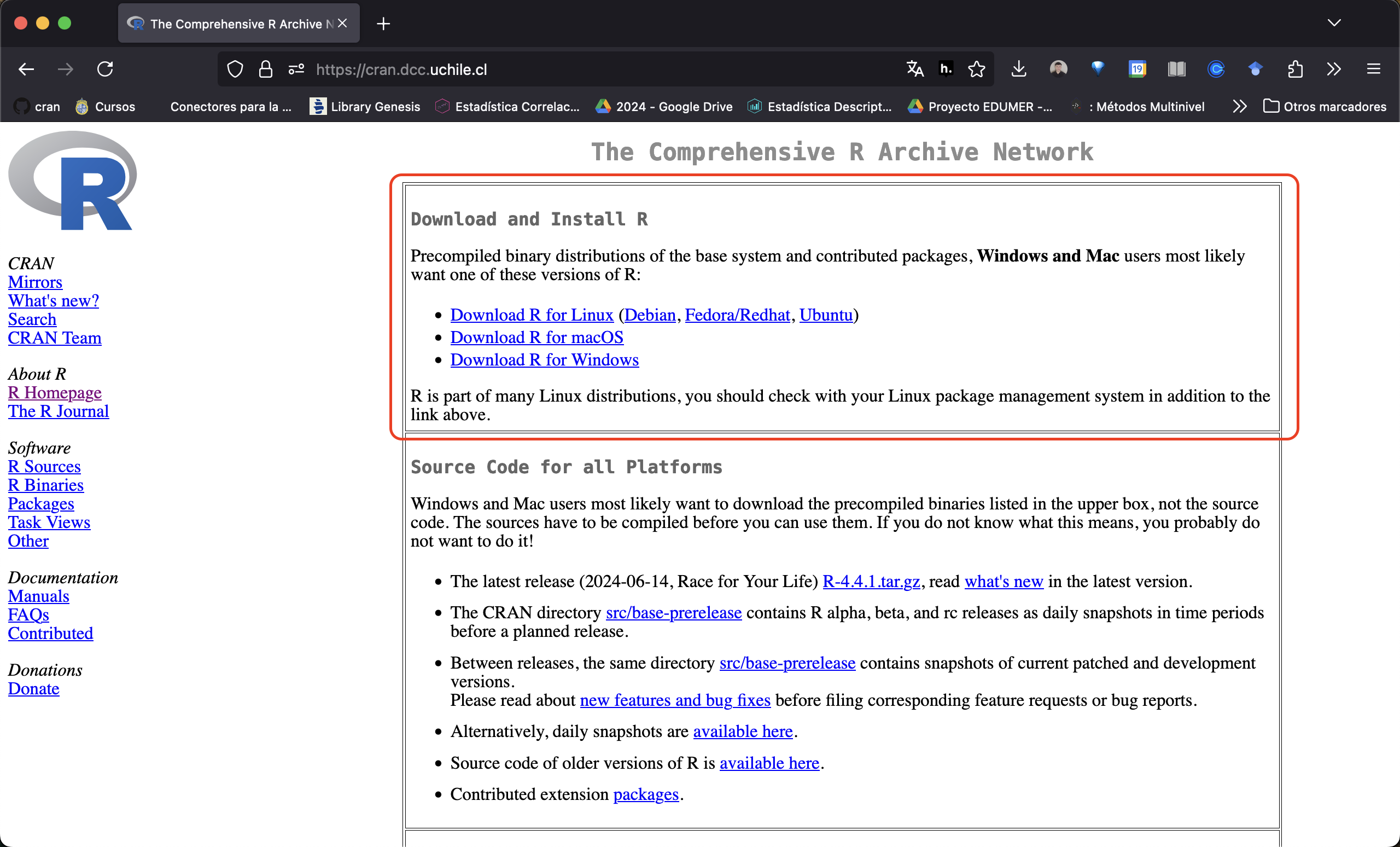 El CRAN que utilizamos es el de la Universidad de Chile. Debes descargar e instalar la versión de R correspondiente a tu sistema operativo. Luego, reinicia tu RStudio. La nueva versión de R se cargará automáticamente.