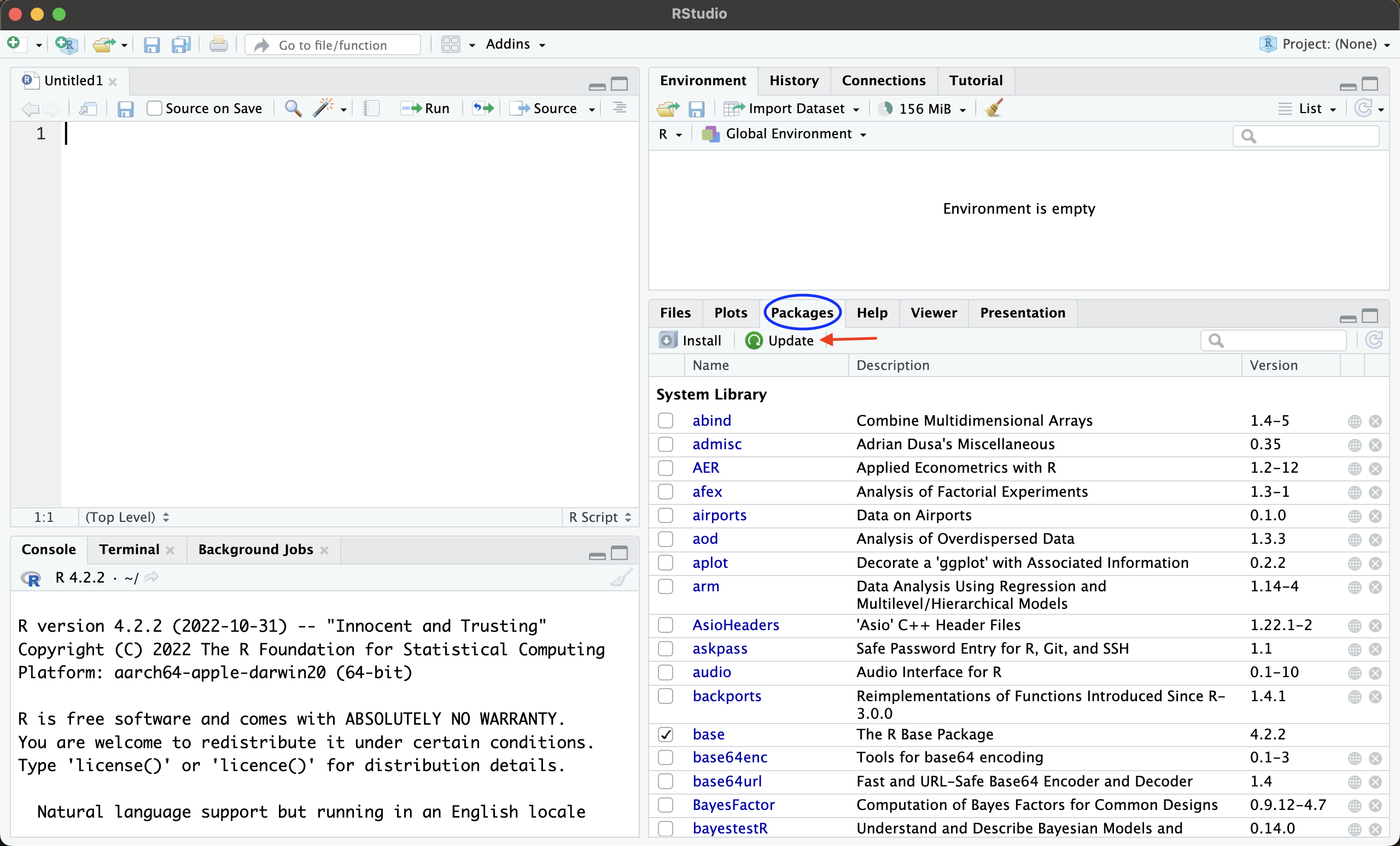Si queremos actualizar una librería en R, lo que podemos hacer es dirigirnos al panel inferior derecho y dar click en la pestaña de “Packages”. Allí, les aparecerá un listado de las librerías que tienen en su computador, una descripción y su versión.