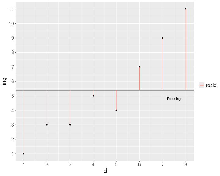 class: front .pull-left-wide[ # Estadística Correlacional] .pull-right-narrow[] ## Inferencia, asociación y reporte ---- .pull-left[ ## Juan Carlos Castillo ## Sociología FACSO - UChile ## 2do Sem 2024 ## [.orange[correlacional.netlify.app]](https:/correlacional.netlify.app) ] .pull-right-narrow[ .center[ .content-block-gray[ ## .gray[Sesión 8:] ## .curso[Asociación y covarianza]] ] ] --- layout: true class: animated, fadeIn --- class: middle .pull-left[ .content-box-red[ ## Hasta ahora (Unidad 1) - Probabilidad, teorema central del límite, error estándar, hipótesis, **diferencias entre grupos** ] ] -- .pull-right[ .content-box-green[ ## Ahora (Unidad 2) - Asociación: ¿en qué medida dos fenómenos (sociales) se encuentran **vinculados**? ] ] --- class: inverse middle center # ¿Por qué es importante estudiar **.yellow[asociación]** en ciencias sociales? --- # Ejemplo: ranking y privados en la educación superior <br> ## [https://observablehq.com/@elaval/perfil-de-carreras-segun-origen-escolar](https://observablehq.com/@elaval/perfil-de-carreras-segun-origen-escolar) --- class: roja ## Objetivos de la sesión de hoy <br> ### 1. Comprender los conceptos de covarianza y correlación ### 2. Aprender el cálculo de ambos coeficientes y su interpretación ### 3. Entender las limitaciones del coeficiente y su consideración en el cálculo e interpretación --- class: middle center # Lectura: Moore 97-131 Análisis de relaciones --- # Ejemplo minimalista: educación e ingreso - simulamos datos para - 8 casos - 8 niveles de .red[educación] (ej: desde basica incompleta=1 hasta postgrado=8) - 12 niveles de rangos de .red[ingreso] (ej: desde menos de 100.000=1 hasta más de 10.000.000=12) --- # Generación de datos para el ejemplo .pull-left[ ``` r educ <-c(2,3,4,4,5,7,8,8) ing <-c(1,3,3,5,4,7,9,11) data <-data.frame(educ,ing) ``` ] .pull-right[ .small[ ``` r kableExtra::kbl(data) ``` <table> <thead> <tr> <th style="text-align:right;"> educ </th> <th style="text-align:right;"> ing </th> </tr> </thead> <tbody> <tr> <td style="text-align:right;"> 2 </td> <td style="text-align:right;"> 1 </td> </tr> <tr> <td style="text-align:right;"> 3 </td> <td style="text-align:right;"> 3 </td> </tr> <tr> <td style="text-align:right;"> 4 </td> <td style="text-align:right;"> 3 </td> </tr> <tr> <td style="text-align:right;"> 4 </td> <td style="text-align:right;"> 5 </td> </tr> <tr> <td style="text-align:right;"> 5 </td> <td style="text-align:right;"> 4 </td> </tr> <tr> <td style="text-align:right;"> 7 </td> <td style="text-align:right;"> 7 </td> </tr> <tr> <td style="text-align:right;"> 8 </td> <td style="text-align:right;"> 9 </td> </tr> <tr> <td style="text-align:right;"> 8 </td> <td style="text-align:right;"> 11 </td> </tr> </tbody> </table> ] ] --- class: middle center  --- class: inverse middle center ## Midiendo dispersión: <br> #### `$$Varianza=\sigma^{2}={\sum_{i=1}^{N}(x_{i}-\bar{x})^{2}\over {N - 1}}$$` --- .pull-left-narrow[ <br> <br> <br> <br> <br> `$$\sigma^{2}={\sum_{i=1}^{N}(x_{i}-\bar{x})^{2}\over {N - 1}}$$` ] .pull-right-wide[  ] --- .pull-left-narrow[ <br> <br> <br> <br> <br> `$$\sigma^{2}={\sum_{i=1}^{N}(x_{i}-\bar{x})^{2}\over {N - 1}}$$` ] .pull-right-wide[  ] --- <!-- --> --- .pull-left[ # Varianza educación `$$Varianza=\sigma^{2}={\sum_{i=1}^{N}(x_{i}-\bar{x})^{2}\over {N - 1}}$$` .small[ ``` r mean(data$educ) ``` ``` [1] 5.125 ``` ``` r data$mean_educ <- mean(data$educ) data$dif_m_educ <- data$educ-data$mean_educ data$dif_m_educ2 <- (data$dif_m_educ)^2 ``` ]] -- .pull-right[ .small[ ``` r kbl(data, digits = 2) %>% scroll_box(width = "500px", height = "450px") ``` <div style="border: 1px solid #ddd; padding: 0px; overflow-y: scroll; height:450px; overflow-x: scroll; width:500px; "><table> <thead> <tr> <th style="text-align:right;position: sticky; top:0; background-color: #FFFFFF;"> id </th> <th style="text-align:right;position: sticky; top:0; background-color: #FFFFFF;"> educ </th> <th style="text-align:right;position: sticky; top:0; background-color: #FFFFFF;"> ing </th> <th style="text-align:right;position: sticky; top:0; background-color: #FFFFFF;"> mean_educ </th> <th style="text-align:right;position: sticky; top:0; background-color: #FFFFFF;"> dif_m_educ </th> <th style="text-align:right;position: sticky; top:0; background-color: #FFFFFF;"> dif_m_educ2 </th> </tr> </thead> <tbody> <tr> <td style="text-align:right;"> 1 </td> <td style="text-align:right;"> 2 </td> <td style="text-align:right;"> 1 </td> <td style="text-align:right;"> 5.12 </td> <td style="text-align:right;"> -3.12 </td> <td style="text-align:right;"> 9.77 </td> </tr> <tr> <td style="text-align:right;"> 2 </td> <td style="text-align:right;"> 3 </td> <td style="text-align:right;"> 3 </td> <td style="text-align:right;"> 5.12 </td> <td style="text-align:right;"> -2.12 </td> <td style="text-align:right;"> 4.52 </td> </tr> <tr> <td style="text-align:right;"> 3 </td> <td style="text-align:right;"> 4 </td> <td style="text-align:right;"> 3 </td> <td style="text-align:right;"> 5.12 </td> <td style="text-align:right;"> -1.12 </td> <td style="text-align:right;"> 1.27 </td> </tr> <tr> <td style="text-align:right;"> 4 </td> <td style="text-align:right;"> 4 </td> <td style="text-align:right;"> 5 </td> <td style="text-align:right;"> 5.12 </td> <td style="text-align:right;"> -1.12 </td> <td style="text-align:right;"> 1.27 </td> </tr> <tr> <td style="text-align:right;"> 5 </td> <td style="text-align:right;"> 5 </td> <td style="text-align:right;"> 4 </td> <td style="text-align:right;"> 5.12 </td> <td style="text-align:right;"> -0.12 </td> <td style="text-align:right;"> 0.02 </td> </tr> <tr> <td style="text-align:right;"> 6 </td> <td style="text-align:right;"> 7 </td> <td style="text-align:right;"> 7 </td> <td style="text-align:right;"> 5.12 </td> <td style="text-align:right;"> 1.88 </td> <td style="text-align:right;"> 3.52 </td> </tr> <tr> <td style="text-align:right;"> 7 </td> <td style="text-align:right;"> 8 </td> <td style="t